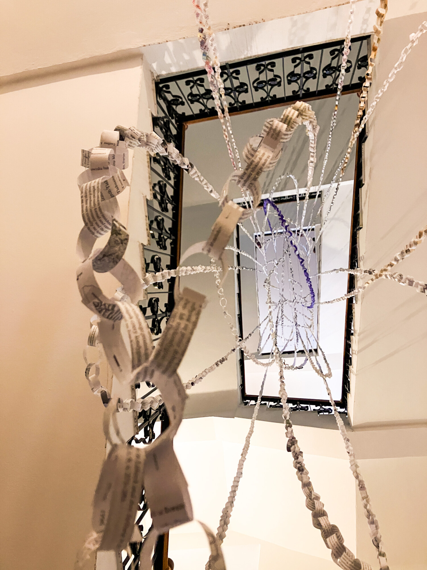 Łącznie zużyto około trzech ryz papieru w formacie A4, a gotowe sekcje wypełniły trzy worki o pojemności 120 litrów. Instalacja składa się z wielu pasm – najdłuższe ma ok. 30 metrów i jest podwieszone w trzech punktach na stalowych linkach zamocowanych na trzecim piętrze budynku. Ogniwa w miejscach mocowania zostały dodatkowo wzmocnione taśmą.