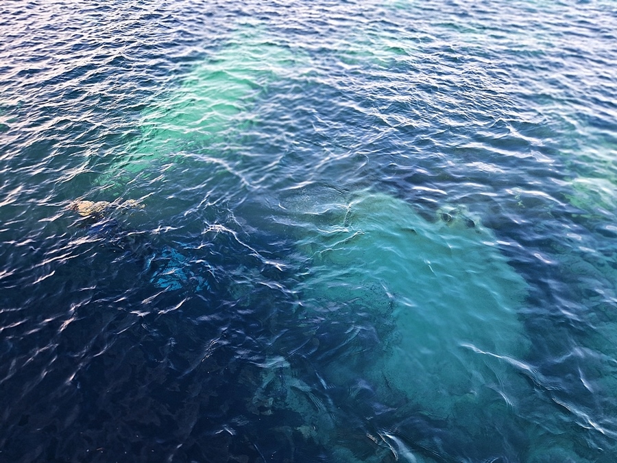 Widok powierzchnia wody po wypuszczeniu oliwy przez płetwonurka.
