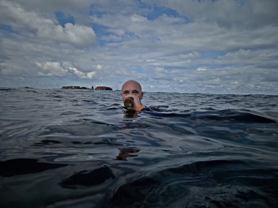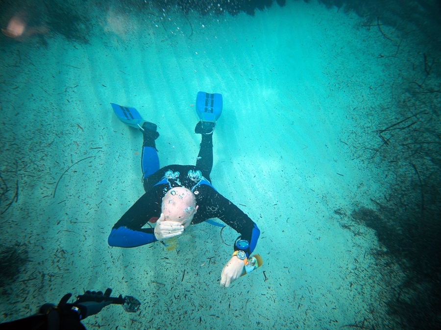 Przygotowania do próby z wypluwaniem oliwy przed zanurzeniem autora.